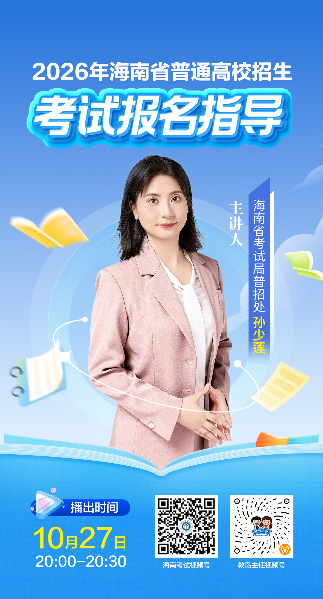 高考 | 海南考试直播间10月27日20:00开播2026年海南省普通高校招生考试报名指导