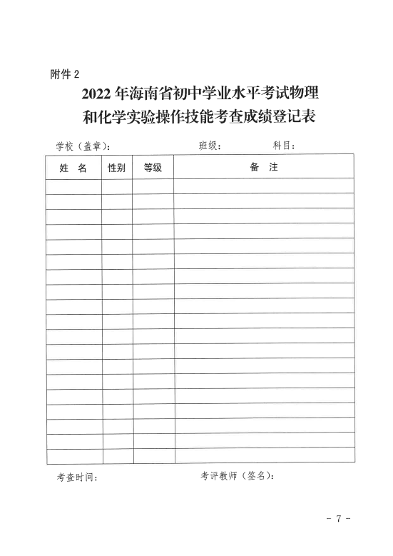 2.2022年海南省初中学业水平考试物理和化学实验操作技能考查成绩登记表