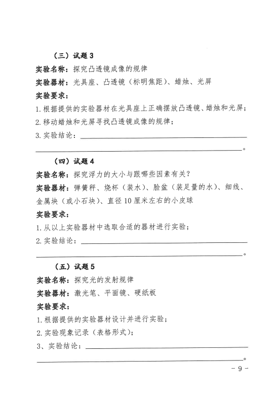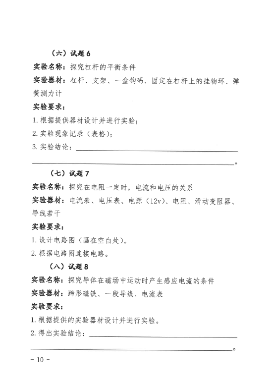 (一)实验操作考查由市县(单位)教育行政部门组织实施,实验操作考查试题由省中招办统一提供。各校可根据现有的实验条件每科至少选择3题作为实验考查试题,每位学生只选做1题。