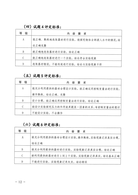 四、省、市县(单位)直属中学必须将省中招办提供的全部试题供学生抽签,考虑到部分乡镇学校实验条件尚不具备,允许其只选择其中3道试题供学生抽签。各校在组织考查前,要将考查试题连同等级评定标准向学生公布。